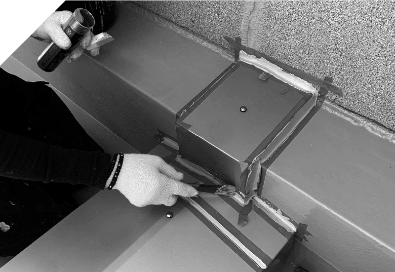Waterproofing/sealing workベランダや屋上の雨水の侵入を防ぐための防水工事。また、扉やサッシまわり、外壁のつなぎ目などをシーリング材で埋め、建物を漏水などから守るシーリング工事を行っています。建物の状況に合わせた適切な工法と、定期的なメンテナンスを大切にしています。